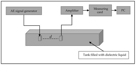 The measurements were conducted in a laboratory. The system was modelled to test the parameters of the acoustic wave propagating in a typical propagation medium such as mineral oil or ester, which are used in the insulation systems of power transformers. A piezoelectric transducer (disc type PRYY+0354, material type PIC255 [26]) was applied as the AE source and a spherical hydrophone type 8105 [27] was used as the AE receiver. Standard AE measuring apparatus was used for signal registration. The signals propagated in a plastic tank of the following dimensions: 187 mm wide, 147 mm high and 1000 mm long. The tank was filled with the considered dielectric liquids, details of their physical properties are given in Table 1. A detailed description of the measuring setup and parameters of the applied transducers is given in previously published work [22]. A scheme diagram of the experimental setup is depicted in Figure 1.