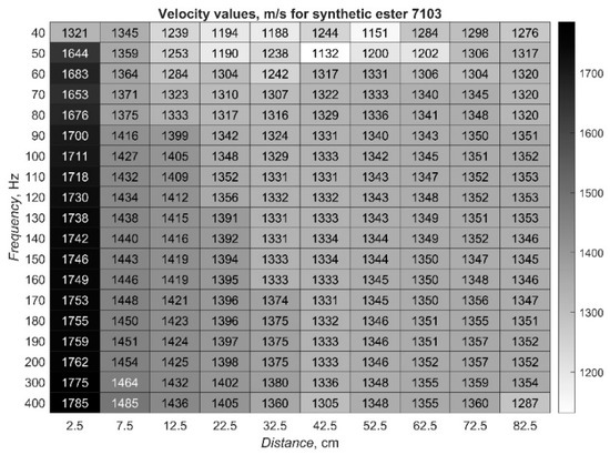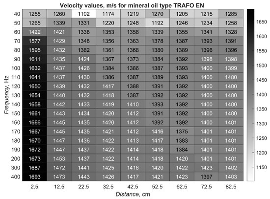 In Figure 4, detailed results depicting the median velocity values calculated for AE waveform generated in synthetic ester at various frequencies and measured at various distances, are presented in the form of heat maps. The values should be read as on a chessboard—each value represents a particular row and column, as described on the axes. The shade of grey corresponds to the AE velocity. Darker fields indicate higher values and lighter fields indicate lower values. The observation of colors allows for the consideration of the dynamics of speed changes, depending on the parameter f or d. It should be noted that in the diagrams, the values are not presented in a linear way for the frequency. Linear increments are used only for distances. Corresponding results gathered for the natural ester and mineral oil are depicted in Figure 5 and Figure 6, respectively.