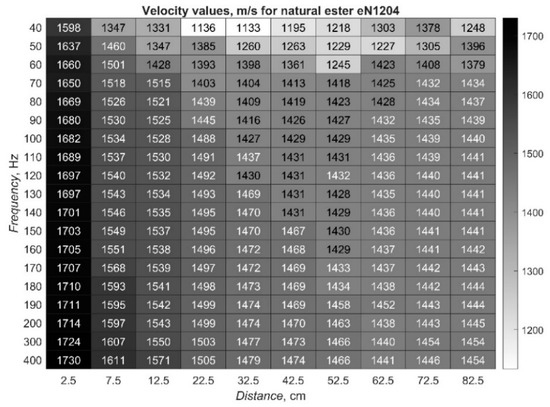 From Figure 4, Figure 5 and Figure 6, it can also be seen that the highest velocities registered were for the greatest frequencies and the smallest distances between the AE source and sensor location. The values reached 1785 m/s for the synthetic ester, 1730 m/s for the natural ester and 1693 m/s for mineral oil. Contrary to this, the lowest values were registered at the smallest modulation frequencies, but at various distances between the emitter and receiver. In these cases, the AE wave propagated at 1132 m/s in synthetic ester, 1133 m/s in natural ester, and 1102 m/s in mineral oil.