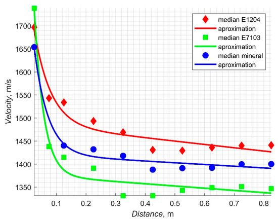 In Figure 7, corresponding results depicting the velocity values in function of generation frequencies are presented. In Figure 8, detailed results depicting the median velocity values calculated for the AE waveform generated in the considered dielectrics, in function of distance between the emitter and receiver, are shown.