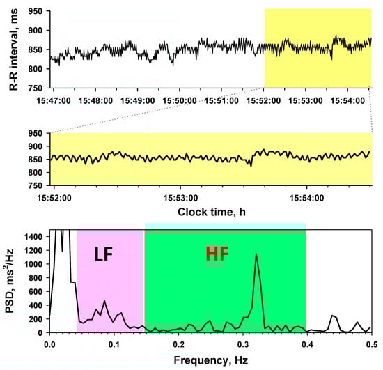 The analysis of heart rate variability (HRV) is widely used for assessing autonomic function. Particularly, the high-frequency component (HF, 0.15–0.4 Hz) of HRV is currently the most popular metric of cardiac vagal function (Figure 1). The association between HF and cardiac vagal function is supported by the fact that respiratory sinus arrhythmia (RSA), the major source of the HF, is mediated purely by the cardiac parasympathetic nerves [1].
