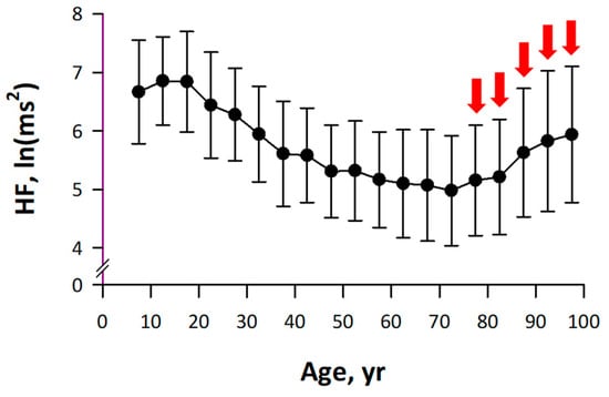 Age-dependent changes in HRV frequency components. Made from data from a previous study [4].