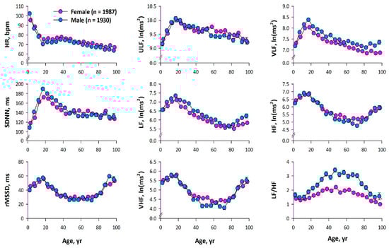 Age and sex dependency of the metrics of heart rate variability (HRV). HR = 24-h mean heart rate, SDNN = standard deviation of 24-h normal-to-normal R-R (NN) intervals, rMSSD = root mean square of successive difference in NN intervals, ULF = ultra-low frequency (<0.0033 Hz), VLF = very-low frequency (0.0033–0.04 Hz), LF = low frequency (0.04–0.15 Hz), HF = high frequency (0.15–0.4 Hz), VHF = very-high frequency (0.4–1.0 Hz), LF/HF = LF-to-LF ratio.