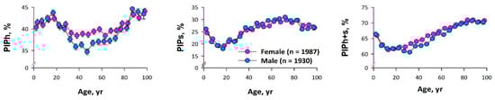 Figure 7 shows the age dependent changes in the three types of PIP in each sex. PIPh increased after birth up to age 20, decreased thereafter, and reached a plateau, but increased again after age 75. PIPs showed changes almost opposite to the age dependence of PIPh. Age-adjusted PIPh was greater in women than in men, but there was no significant difference in PIPs (Table S1).