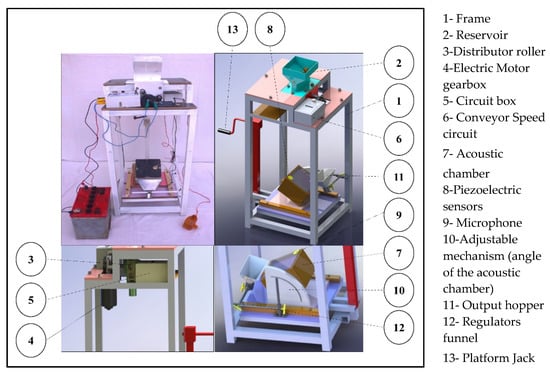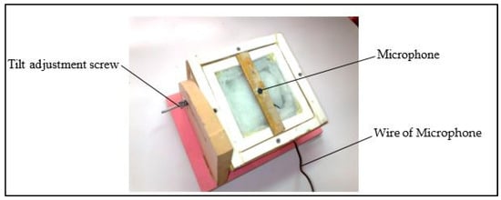 - An acoustic chamber was designed to avoid the effects of external noise (Figure 4). Sound insulating materials (Isoham insulation) were used in the interior chamber structure. The microphone was placed about 5 mm below the disk. An acoustic chamber was placed on a hinge joint so that the desired angle could be adjusted. This prevented the hazelnuts from moving outside due to collision with the disk. Since the distance between the distributor and the acoustic chamber affected the quality of the signal received by hazelnuts, the platform jack was used to change this distance to optimize the received signals.