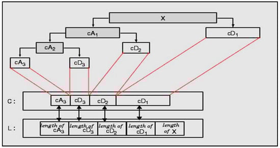 These two equations state that by calculating the sum weighted sum of the scaling function coefficient from the previous scale, we can find wavelet and scaling function coefficients at the specified scale. Figure 12 and Figure 13 indicate a discrete wavelet transform for an arbitrary signal in three stages [17,21,22,23].
