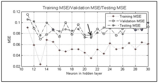 In this network, iteration numbers and MSE of the learning data were considered powerful validation criteria because they impact the selection of the best training in optimal generalization point, the reduction of experimental errors, and the prevention of overtraining data. The Levenberg–Marquardt algorithm was used to train the network. In order to find the optimal value of the structure neural network, the k-fold cross validation was applied to perform the classification. For this example, 70%, 15%, and 15% of the data were selected for training, testing, and cross-validation (in this network, respectively). The number of neurons in the hidden layer was changed from 10 to 30 neurons, and the optimal number of neurons was obtained through trial and error. The least error was obtained for 21 neurons in the hidden layer (Figure 14) [22,24].
