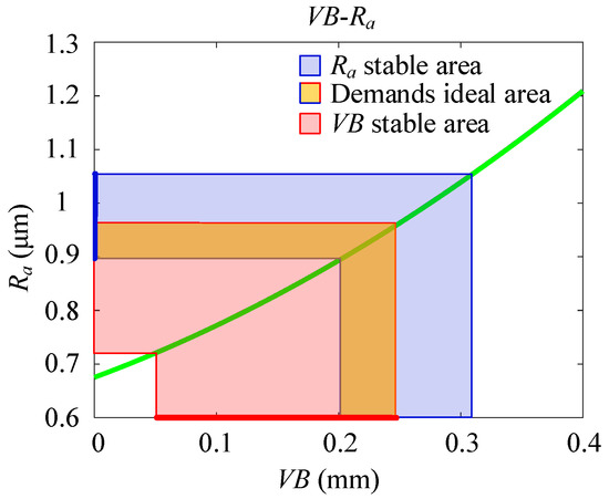 Furthermore, Ra and VB are affected by many different factors, and they have different distribution characteristics and different relatively stable region. As shown in Figure 1, since the relationship between Ra and VB not strictly linear, stable areas of them are not completely overlapping. In the field of aerospace, the stability of workpiece quality is critical [29]. During processing, the stable areas of Ra and VB are expected to overlap as much as possible to ensure processing stable and high quality. However, due to the diversity of processing demands, the overlap area of Ra and VB is usually small, and the stable performance area of a tool is not fully and reasonably applied. If the coincident areas of the Ra stable areas and the VB stable areas is defined as the ideal demand area, a more reasonable application is clarifying the relationship between Ra and VB and maximize the use of stable overlapping areas. Then locating the processing demand in the roughness stable area, as this part coincides with the wear stability. However, tool wear is not the only factor affecting the surface roughness, there are other factors that cause the stability areas of Ra and VB to not completely coincide. In addition, the machining requirements are different, tools that do not meet the blunt criteria may not continuously meet machining requirements as the tool wear progresses, under certain processing requirements. The ideal area of Ra under the experimental conditions results in VB entering the accelerated wear phase very quickly, while other unsteady regions exhibit a rapid change of Ra and VB. This behavior is clearly not conducive to the processing stability. So, before establishing a clear relationship between Ra and VB, it is very necessary to define the tool life based on the surface quality that can characterize the tool performance, which links the tool wear, surface quality, and machining demands together.