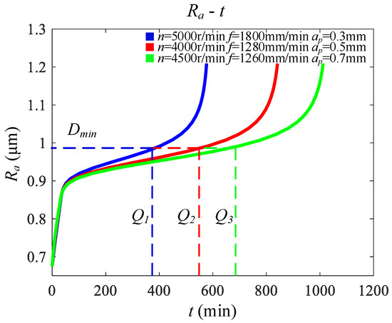 Here, tool life is defined as the maximum working time for a particular tool without exceeding the minimum machining demand Dmin under certain conditions, also known as tool milling quality life, Q. It is important to note that Q is defined based on the machining demand rather than tool wear; in this study, the tool wear is considered too ambiguous to connect with the machining quality and machining demands, as well as reflecting the tool processing performance. The Dmin in Figure 2 is utilized to form the most basic processing requirements, which can comprise a large scope of requirements. Some of these requirements are minimum quality, minimum processing efficiency, and minimum cutting force, among others, or a combination of them. However, this paper only focuses on studying and discussing the surface roughness with respect to the demand index. It is assumed that the processing order has no significant effect on tool damage, based on the damage accumulation theory [32], and there is no uniform standard for the value of the tool milling quality life. Additionally, tool milling quality life should varies depending on the specific machining requirements, the tool utilized, and the cutting conditions, as shown in Figure 2. In this study, for a certain surface roughness demand Dmin, different machining conditions result in different tool lifetimes. As shown in Figure 2, the tool milling quality lifetimes, Q1, Q2, and Q3, also show the ability to maintain consistent quality of the same tool under different processing conditions. When specific machining demands are proposed, the quality life as the link between the machining quality and the tool lifetime can be used to select the tools that meets the machining demands or to determine the machining conditions, otherwise, it can also predict the tool machining quality at any certain processing stage.
