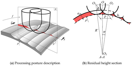 The milling part is shown in section A-A of Figure 3a,b, O1 denotes the center of the ball end milling tool in processing, and O2 denotes the center of the ball end milling tool on the adjacent tool path that has just been milled. The residual height is expressed as Equation (1) due to the change in curvature, and is related to the curvature ρ, where R is the radius of the ball end milling and p is the row spacing. Additionally, h(θ) is the contour height function, as shown in Figure 4. The h(θ) can be deduced in an analytical form.