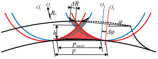 When ball end milling is used to process a titanium alloy, flank wear is the main form of failure [33]. Both the tool lifetime and flank wear are dependent on time. As time increases, the wear can indicate the decline of the tool processing performance. Moreover, the contour of the cutting edge shrinks inward as the wear progresses further. The contour contraction, caused by radial wear, can be equivalent to the increase of the offset, or row spacing, of a milling tool. This can be shown from O1 to O2, or from Pinitial to p, as in Figure 5. Meanwhile, the variation in the line spacing and corner can be used to replace the shrinkage of the tool wear profile to achieve an equal effect, which is the increase in the surface residual height. In this paper, the method of equalizing the shrinkage of the tool profile caused by the wear to the increase of the line spacing or the corner is proposed as the equivalent line spacing or the equivalent corner method. The equivalent angle and row spacing method can be used to establish the relationship between Ra and time variation. Here, the equivalent rotation method is used, and the contraction of the contour can be equivalent to the variation of the rotation angle Δφ.