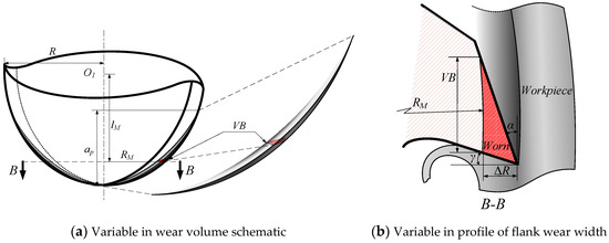 As shown in Figure 6, based on previous studies [11], ΔR, lM, and RM are the radius variation, depth, and truncation radius at the maximum wear point of the ball end milling cutter, respectively. In particular, the maximum wear point was determined by parsing the traditional tool life model built based on tool wear as a position function. The study conclusion shows that the point of minimum tool life is the point of maximum wear of the cutting edge, then, the maximum wear point coordinate x2 and the cross-sectional circle radius R(x2) were derived, the correctness of which has been confirmed. Their expressions are given as follows: