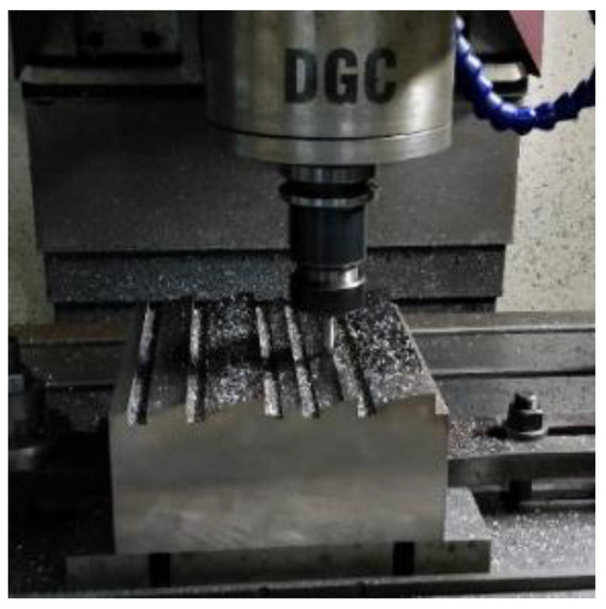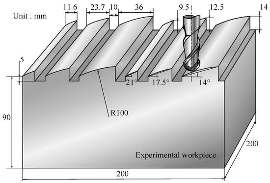 The asymptotic significance is less than 0.05, making the samples highly consistent. A consistency of up to 0.961 and the Chi-square coefficient shows that the samples were independent of each other. The hardness of the TC4 titanium alloy blank was 30 HRC. In order to cooperate with the experiment to study and verify the relationship between wear and surface quality, the workpiece is planned as multiple segmented surfaces. Besides, the segmented surfaces are set to be inclined at a certain angle to avoid vertex milling and to replace the tool axis inclination angle, so the experiment can be simply conducted on a 3-axis VDL-1000E machine, the detail geometric parameters are shown in Figure 9. In particular, because this study did not focus on the impact of the tool axis inclination angle on the surface quality, the inclination values of different groups of segmented surfaces were specially set so that the cutting edge participates approximately in the same range. During the experimental preparation, the curved surface was produced by wire cutting with cutting fluid. During processing, the part was machined without cutting fluid and at the ambient temperature of 15 °C, as shown in Figure 10. Furthermore, the flank wear was measured using the ultra-depth of field of the microscope VHX-5000.
