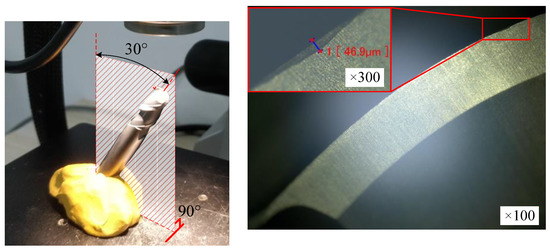 In this paper, the wear volume was not measured. Instead, the projection width of the maximum wear, as well as the projection length of the maximum wear point from the milling ball apex were measured with the tool tilted at an angle. For accurate observation and measurement, the tool axis was adjusted to an angle of 30° from the vertical, while maintaining the base plane that crosses the maximum wear point vertical to the horizontal plane, as shown in Figure 11. Specifically, the surface of this experiment was divided into multiple segments, and its curvature was set to 0.01 during the experimental design phase. This is a comprehensive design result that also takes the subsequent research into consideration.
