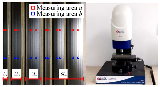 The surface roughness of the test piece was detected by Taylor Hobson. A CCI white light interferometer and the measurement position and area are shown in Figure 12. As shown in Figure 10, the surface was divided into multiple segments, and the measurement points were located at 1/3 and 2/3 of each surface. For the comprehensiveness and accuracy of the Ra measurement, areas a and b were set in one measurement, and each of them respectively contained a pair of affiliated measurement areas for taking averages [36]. Finally, each sub-surface’s roughness is represented by the average of areas a and b. To measure the wear, the total time for the tool to travel over a certain surface needs to be recorded. Thus, a new tool must be used for each group of experiments. After milling, the wear of the measurement position was estimated by the final wear of this group, as well as the time recorded. Normal wear is a slow process, and previous trial milling experiments have proven the feasibility.