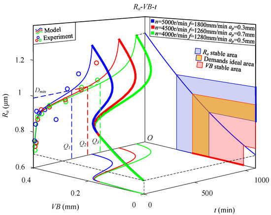 In addition, the simulation adopts the same three machining conditions as the orthogonal experiment. The above contents are used as the input parameters and condition employed of model (9), (11) and (12), so that the numerical simulation can be realized based on MATLAB software. As shown in Figure 14, the VB-Ra-t three-dimensional curve can be generated by combining Ra-t model and VB-t model. By projecting the three-dimensional curve on the t-O-Ra surface, the relationship of Ra-t can be obtained, which is consistent with the Figure 2 and Figure 13, and by projecting the three-dimensional curve on t-O-VB surface, the relationship of VB-t can be obtained. Furthermore, when model VB-t and model Ra-t are merged without t variable and the three-dimensional curve is projected on the VB-O-Ra surface, the relationship curve of Ra-VB can be generated, as shown in Figure 14, which is consistent with the Figure 1.