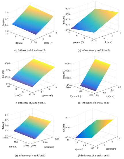 As shown in Figure 15a, the effect of α on Ra is more significant than that of R. Ra positively correlates with R, but negatively correlates with α. Thus, to ensure the quality of the processing, unless there is a specific demand, when designing the tool parameters, it is inadvisable to design the tool with a small α value and large R value. A similar situation also occurs in the effects of γ and R on Ra, as shown in Figure 15b. From Figure 15a,b, it can be seen that the effect of R on Ra is almost linear. However, the effect of α on Ra appears as a concave function, and the effect of γ on Ra appears as an upper convex function, as shown in Figure 15c, comparing the cross factors γ and β, β has almost no effect on Ra. However, this is relative, as shown in Figure 15f; when f is compared with β, β has a greater effect on Ra, and as shown in Figure 15c, if the two factors β and γ present a great influential difference on Ra, the main design or selection object of the tool is γ when the consistency of the tool during processing is insufficient, while β with a relatively weak influence can be selected according to other influencing factors. A similar situation also occurs in the effects of γ and R on Ra, as shown in Figure 15d,e,g.