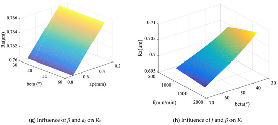 The simulation, based on Equation (9), was performed as shown in Figure 15a–h, which shows the influence of the tool design parameters and milling parameters on Ra. Any unnecessary cross-factor analysis was omitted, and the intra-group interaction analysis of the main factors affecting Ra was completed, as shown in Figure 15a–e. Additionally, (a)–(c) represent the cross-factor analysis of the tool design parameters, and (d) and (e) represent the cross-factor analysis of the milling parameters. In particular, the variables and dependent variables displayed on the axis were the objects in the analysis, and the other factors not involved in the images were set as fixed values for comparison purposes. For example, in Figure 15c, the independent variables analyzed were β and γ, and the dependent variable was Ra, then, β and γ were the variables within a certain range, and Ra changed accordingly, while the parameters not involved in Figure 15c were set as constant, such as the tool parameters, radius R, number of teeth Z, flank angle α, machining parameters, feed f, milling depth ap, speed, n, line spacing, p, those of the workpiece being machined, and curvature ρ. The dependent variable generated a surface with the change of the two independent variables, and the surface synthesis reflects the interaction of the two independent variables on the same dependent variable.