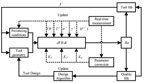 Based on the above conclusions, the general method of performance design can be concluded as shown in Figure 16. After inputting the processing conditions, tool geometry parameters, and processing time, dVB/dt and Ra can be obtained, where Ra is used as the performance index of the tool design. By defining the tool milling quality life failure criterion, the tool geometry can be designed with appropriate algorithms. At the same time, the machining time required can be obtained and the tool life prediction can be realized. Through substitution of the measured VB, the remaining tool life can be predicted for the worn tool. As tool wear increases, the tool geometry will change significantly. It is necessary to continuously correct the tool geometry parameters and coefficients in the model through the measurement data to ensure accuracy of the prediction and design.