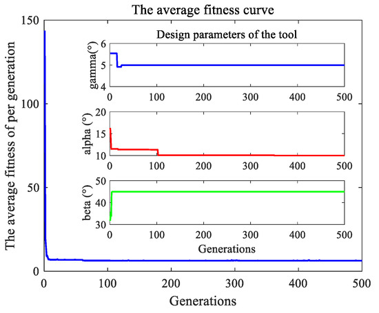 Based on the above study, if the tool milling quality lifetime is set to ensure that the maximum surface roughness Ra does not exceed 0.8 μm and the continuous processing time of the tool is greater than 10 h, then the genetic algorithm (GA), along with the objective function of Formula (9), can be utilized to convert these tool requirements into the design and milling parameters of the tool, where γ, σ, β, n, f, and ap are considered optimization objects. The optimization of the GA, along with other parameters, was set as in ‘4 Experiment and verification,’ as shown in Figure 17.