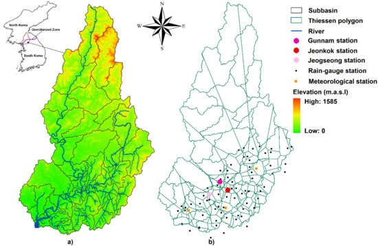 Because of the situation of the study catchment, with two third of area placed in North Korea, the data in the Northern part of the basin are hard to access due to political boundaries for transboundary rivers. Additionally, Paju-si, a military zone located in this region that is used in river-crossing operations, is also influenced directly by flood hazards. The improvement of flood forecasting systems is intrinsically related to military operations. Nevertheless, the area includes 38 subbasins with 68 rain-gauge stations, three meteorological stations, and three flow stations (