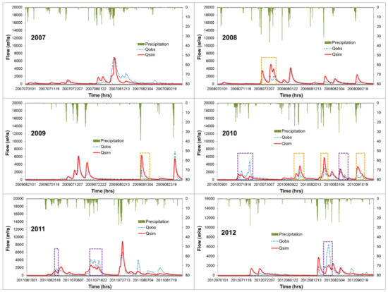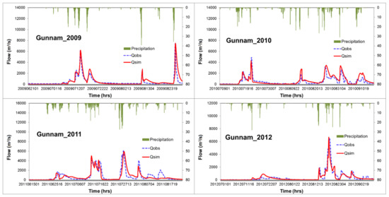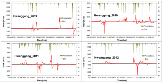 Table 1. It is clear to see that, in 2008, 2009, and 2010, especially in the 2008 event, the flow rate computed using observation data was smaller than other years. This may be due to the water storage of Hwanggang dam in those periods. This conjecture is reliable when referring to the observed rainfall in the same period at Gunnam station, where the streamflow was influenced directly and strongly by dam operation. In some events, the periods of storing water generally took place shortly before or after the period of releasing water from the dams.