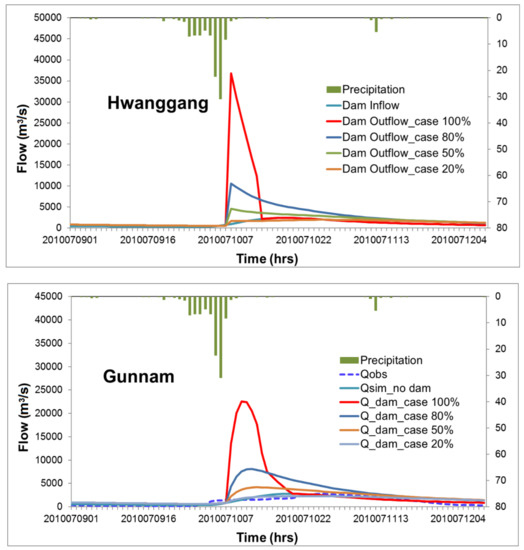 To run all flood scenarios caused by dam failure, in this study, the event in 2010 was simulated with the starting time of the dam failure at 10:00 am on 2 September 2010. The simulation results of peak discharges in Gunnam station and Hwanggang dam are shown in