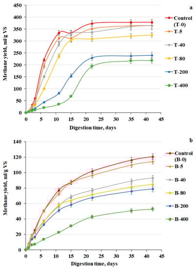 Dynamics of methane accumulation (ml/g volatile solids (VS) initial) in experiments on the determination of polyacrylamide (PAM) toxicity (a) and PAM biodegradability (b). Specific methane yield was calculated considering the organic matter of the PAM.