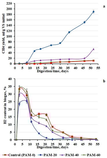 Dynamics of methane accumulation (ml/g VS initial) (a) and hydrogen content (%) (b) in biogas in bioreactors destabilized due to accumulation of high volatile fatty acid (VFA) concentrations operated without mixing after addition of different polyacrylamide (PAM) concentrations for the restoration of methanogenesis: Control (PAM-0) without the flocculant; PAM-20, PAM-40, and PAM-60, the flocculant concentrations 20, 40, and 60 mg/g TS, respectively. The X-axis begins (0 days) on day 7 of the experiment when the flocculant was added.