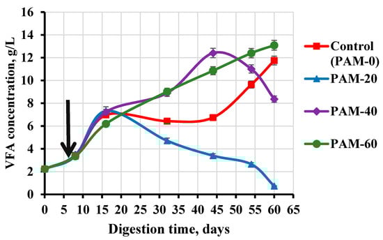 Dynamics of volatile fatty acids (VFA) accumulation and consumption (overall concentrations of acetate, propionate, and butyrate, g/L): Control (polyacrylamide (PAM)-0) without the flocculant; PAM-20, PAM-40, and PAM-60, the flocculant concentrations 20, 40, and 60 mg/g total solids (TS), respectively. Time of the flocculant addition is indicated by the arrow.