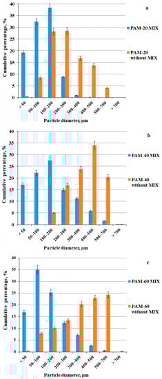 The floccules size and the duration of their existence were shown to be of critical importance for the restoration of methanogenesis. The results of the granulometric analysis of the samples of the digested mass collected by the end of the experiment are presented in Figure 4. Both in the control samples and in all samples before the PAM addition, particles smaller than 50 µm in diameter constituted 51.5 ± 0.4%, while 28.8 ± 1.3% had a diameter of 50‒100 µm. No particles over 300 µm were present. In PAM-treated samples incubated without mixing, 91.3‒99.8% of the particles were from 100 to 700 µm in diameter.