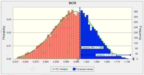 An interesting comparison was published by Emhjellen [17], who dealt with the difference of values when setting different limits of normal distribution and their effect on the resulting values. Kumar [18] noted that the concessionaire aims to bear minimal cost, so maximum probability occurs at lower cost values, and hence it followed a lognormal probability distribution. Jakiukevicius [19,20] worked with normal and triangular distributions, for which he set theoretical parameters which he, based on simulations, converted to log logistics parameters. Kumar [18] adhered to a lognormal distribution of project costs. Gorecki [21] used a triangular distribution. The Czech author Hnilica [22] worked with the beta-PERT distribution, which he considered to be smoother, with possible values more concentrated around the most probable value, and the probability decreases towards the limit values faster than linearly. The authors of this article believe that the beta-PERT distribution best fits an expert estimate of the investment costs behaviour in comparing their values in the ex-ante and ex-post phases. The authors of this article carried out project simulations as mentioned above, assuming both a probability distribution of beta-PERT, and an asymmetric triangular one, and state that the results of the outputs in the expected value of “BCR-mean” ranged up to 7% for all of the projects. The outputs of all projects in both variants of solutions proved the normal distribution of the BCR indicator. The authors of the background research [4] reached the same results, where they stated that an experiment which identifies a pseudo-random number sequence as normally distributed was carried out. The reading of the frequency distribution of the evaluation indicator provides information of extreme importance, as regards the riskiness of the investment project [23].