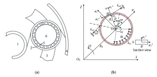 The schematic of a planetary gear system and the vibration model of a planet ring are shown in Figure 1a. The rotating speed and revolving speed of the planet ring are ω and Ω, respectively, and the ratio of Ω and ω is i0 = Ω/ω. The stationary basis is {i, j, k}; the origin O1 of {e1, e2, e3} basis is set to the center of the ring, where the direction of e1 is along the extension of O0O1. The basis {e1′, e2′, e3′} is a local coordinate system with the origin O2 on the middle surface, and e1′ is along the radial direction of the ring. u(θθ, t) and v(θ, t) are radial and tangential deformations, respectively. M is a material point on the ring and ϕ is the relative angle of e1′ to the basis e1, where ϕ = ωt + θ, θ is the specified angular coordinate of the point M around the planet ϕring. R0 is the revolving radii, and R1 is the radii of the middle surface. The density of the ring is р, its elastic modulus is E, and its section area is A with width B and thickness h. Moreover, km1 and km2 are mesh stiffnesses between planet ring with sun gear and ring gear, respectively; α is the pressure angle of kmi on the ring, and apparently the mesh stiffnesses will affect both the radial and tangential deformations. When a planetary gear system runs, the contact zone between planet ring and rolling bearing usually concentrates on a part of the whole circle contact area [28] because of mesh forces. Hence, the planet ring is supported in the radial direction by discrete partially distributed stiffnesses, as shown in Figure 1b, and each spring denotes the position of a roller in the bearing and its position to e1 is θbi. The support stiffness of the roller is kbi, and the values of all kbi are assumed to be the same. The positions of km1 and km2 to e1 are θmi (i = 1, 2). Because the planet ring rotates, θbi and θmi are time dependent, and θbi = θbi0 − ωt, θmi = θmi0-ωt, respectively, where θbi0 and θmi0 are the original angles to e1. θmi0 is determined by the geometry of mesh pairs in the planetary gear system, and θbi0 is determined by the selected bearing.