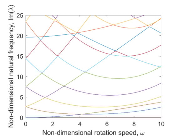 The dimensionless natural frequencies with respect to dimensionless rotation speed with the parameters in Reference [22].