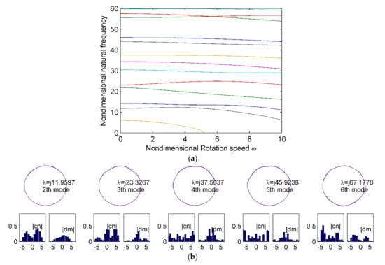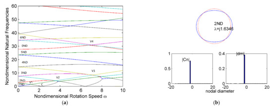 In practical applications, such as planetary gear systems, planet rings behave like free rings in idle status. Figure 3a shows the natural frequencies of a free planet ring, with parameters in Table 1 calculated by the Galerkin method. The natural frequencies have degeneracy two, which is typical in axisymmetric spinning systems, like spinning disks [31] and spinning disk-spindle systems [32]. Two natural frequencies with the same nodal diameter separate at non-zero rotation speed and become different as shown in Figure 3a. One represents vibration waves propagating in the positive θ direction, and the other represents vibration waves propagating in the negative θ direction, which corresponds to backward waves and forward waves, respectively. Moreover, the corresponding vibration mode for all the frequencies is dominated by only one nodal diameter. The representative vibration mode and its components at ω = 1 are shown in Figure 3b. The eigenvalues for the system are purely imaginary over the range of analyzed speeds. It can be found that 1ND backward frequencies intersect with abscissa at point C in Figure 3a. This indicates that possible unstable phenomena exist and the value at point C is the critical speed.