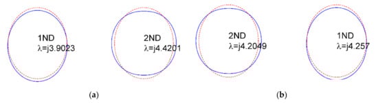 After substituting Equation (23) into Equation (22), the order numbers of radial and circumferential basis functions are 2N + 1 and 2M + 1, respectively. According to the Galerkin method, each formula is multiplied by the conjugate function of each corresponding basis function and then integrated. Thus, 2 (N + M + 1) × 2 (N + M + 1) formulas can be obtained, namely the size of matrices [M], [G], and [K] are 2 (N + M + 1) × 2 (N + M + 1). Each element of these matrices can be calculated according to the element formula under Equation (24). Choosing proper basis functions ϕn (θ) and φm (θ), the eigenvalue problem of Equation (24) can be solved following the state space eigenvalue problem, as described in Reference [30], and the numerical calculation can be made by standard methods.