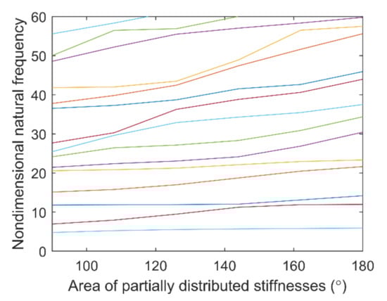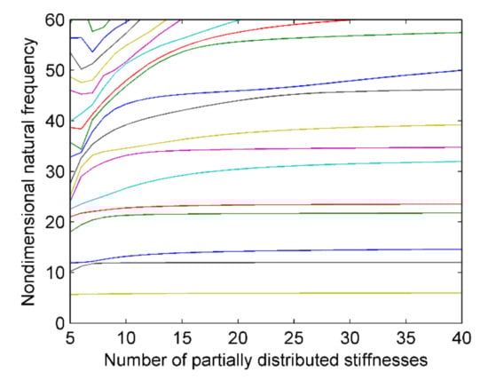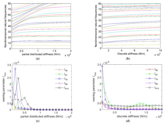 Figure 8a shows the influence of partially distributed stiffnesses to natural frequencies. It can be seen that only higher-order frequencies are affected largely by partially distributed stiffnesses. Moreover, in the analysis range of partially distributed stiffnesses, there is no obvious frequency veering phenomenon in Figure 8a. To analyze the mode veering properties, a veering parameter, ξmn, is chosen, as done in Reference [25], and can be calculated as follows. Equation (24) can be rewritten in the state space form, as follows: