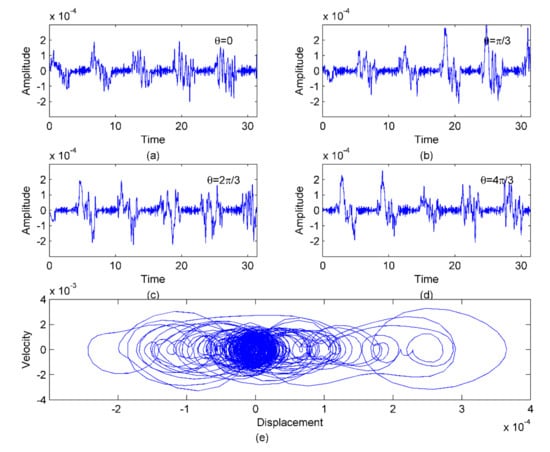 Figure 9 shows the forced responses of the planet ring under the excitation of rotating and revolving movement at the rotating speed ω = 1. Here the forced responses of radial direction at different positions are illustrated. It is obvious that, although the forced responses are nonlinear, as shown in Figure 9e, the forced responses at different positions exhibit some periodic behavior with a quasi-period of rotating speed, ω, as shown in Figure 9a–d. The regions with small amplitudes in Figure 9a–d mean that the partially distributed stiffnesses are passing through this position, and the regions with large amplitude mean that the partially distributed stiffnesses are out of the position. These phenomena imply that the forced responses of the planet ring will vary with a quasi-period of its rotating speed, and the partially distributed stiffnesses will suppress its vibrations.