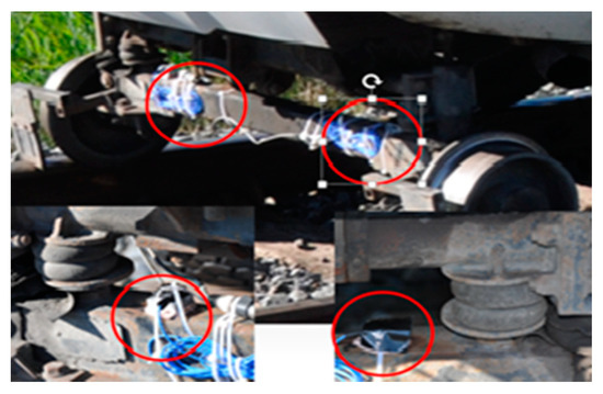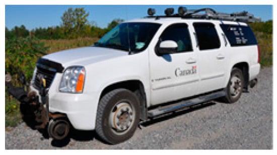 In this study, the investigation uses the acceleration data collected by two accelerometers installed on a rail inspection vehicle (as shown in Figure 1) owned by Transport Canada. The two sensors measure acceleration signals in vertical directions at two locations—i.e., left and right—as shown in Figure 2. A segment of track with many rail joints was selected to collect the acceleration data.
