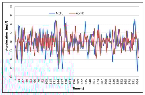 In order to collect enough data points during the high frequency impact due to the joint discontinuity, a sampling rate of 464 Hz was used in the data acquisition system. This particular sampling rate was set by the acceleration data system. Figure 3 shows a typical piece of the time series data collected through a test run. As multiple accelerometers are mounted on wheels of ‘right’ and ‘left’ sides, a joint (or a surface defect) on one side of the track can also be observed in the data of the other side and vice versa [21,22]. If the data for the right and left rails is analyzed separately for the defect detection on each side, extra verification tests have to be considered to decrease the false alarm rate. Therefore, a robust algorithm should take the data of both sides into account and identify if there is a joint (or defect) at the location and on which side of the track the joint (or defect) is located.
