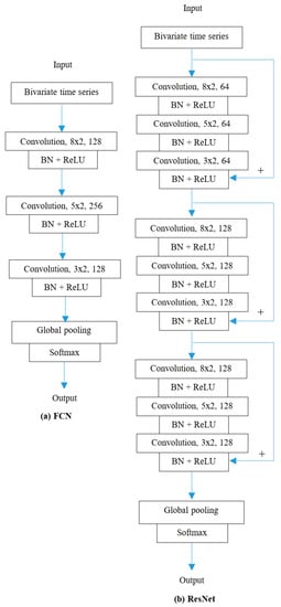 Convolutional neural networks have achieved groundbreaking performance in image recognition and there are numerous variants of CNN architectures reported in the literature. In [27], several deep learning networks were empirically studied for the task of univariate and multivariate time series classification. These studies suggest ResNet [30,31] and fully convolutional networks (FCN) [28] achieve better performances than the others. Therefore, in this paper ResNet and FCN are investigated. The same network structures of ResNet and FCN presented in [28] are adopted. They are reconfigured for bivariate time series classification. Figure 5 shows their structures.
