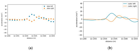 where, is a bivariate time series of acceleration data of left and right track respectively. There are m data points in this sample, which is different from sample to sample. There is another index vector with each indicating the location of the data point . The distance between two adjacent data points might be different but the distance interval of the sample , fixed by the sliding window size, is the same for every sample. The first step is to create the curve-fitting functions by the “interp1d” class from Python package “SciPy-interpolate” [32] for left and right separately as expressed in Equation (6) and Equation (7).