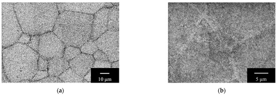 Microstructure of the applied Ti-22V-4Al alloy with a homogenous and fine α-phase precipitation from SEM analysis: (a) low-magnification and (b) high-magnification images. The material was polished to a mirror finish and then etched with Kroll’s reagent (HF:HNO3:H2O = 1:2:50) for 8–10 s.