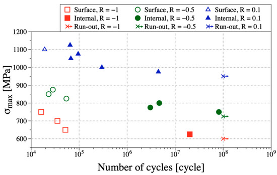 Figure 2 shows the relationships between the maximum applied stress () and the number of cycles to fracture (Nf) for the different stress ratios (S–N curves). When R = −1, the S–N curve exhibited a step-wise (or duplex) shape. In addition, the gradient of the S–N curve changed twice (the changing point is hereafter referred to as the “transition point”). First, the fracture mode of the specimens was a surface fracture mode in the high stress regime, and the first transition point occurred at approximately 5 × 104 cycles. Then, a region in which surface fracture does not occur, which represents the fatigue limit of surface fracture, lasted until 2 × 107 cycles, which is regarded as the second transition point. After the second transition point, the fracture mode of the specimens changed into an internal fracture. Similarly, when R = −0.5, the S–N curve of the specimens exhibited a step-wise shape. In addition, the first transition point at R = −0.5 occurred at a similar cycle as R = −1. However, the second transition point characterized by internal fracture appeared earlier than that of R = −1. In contrast to R = −1 and R = −0.5, when R = 0.1, only one surface fracture was obtained. In addition, it was difficult to accurately determine the first transition point when R = 0.1. However, the second transition point at R = 0.1 appeared earlier than those of the other stress ratios, and the shape of the S–N curve was close to asymptotic under R = 0.1. The loading cycles between the first and second transition points reduced with an increase in stress ratios. The reason for evolution of the S-N shape of the β titanium alloy is not yet properly understood. However, these observations are consistent with the findings of Shiozawa et al., indicating that the trend in Figure 2 is a common fatigue characteristic of β-titanium alloys [15].