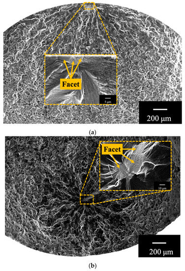 SEM images of the multiple facets under negative stress ratios. (a) = 800 MPa, R = −0.5, Nf = 4.7 × 106; (b) = 625 MPa, R = −1, Nf = 2.0 × 107.