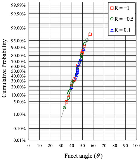 Figure 4 shows the schematic of facet angle measurement. The facet angle θ was calculated from the arc tangent of the vertical height and horizontal length. A total of 41 facets were measured, and the measured angles were plotted into a normal distribution paper regardless of the fracture mode, as shown in Figure 5. The cumulative probability was calculated using Equation (1):