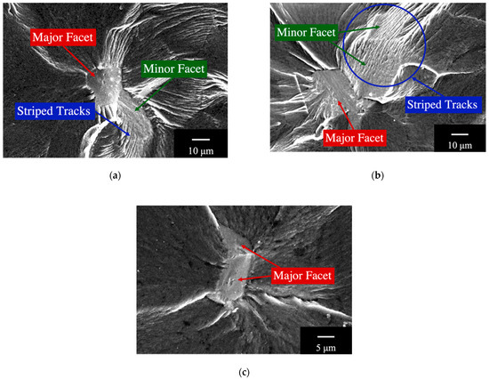 SEM images of the multiple facets under positive stress ratio. (a) = 1125 MPa, R = 0.1, Nf = 6.5 × 104; (b) = 975 MPa, R = 0.1, Nf = 4.5 × 106; (c) = 1000 MPa, R = 0.1, Nf = 3.0 × 105.