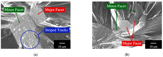 Figure 7 shows the 2D-SEM images of the multiple facets of the internal fracture under negative stress ratios. Similar to the fractographic results obtained under positive stress ratio, major facet(s) with a smooth surface and clear grain-shaped boundary, and minor facet(s) with striped tracks were observed. However, compared with the striped tracks of the minor facet surfaces under positive stress ratios (Figure 6a,b), those under negative stress ratios were less remarkable (Figure 7). This phenomenon can be explained by the fact that the striped tracks on the facet surfaces were already completely formed during the formation of the minor facets before the propagation of the crack outside the multiple facets. However, they were subsequently diminished by the compressive process under a negative stress ratio. This provides insights on the different formation processes of the major and minor facet(s).