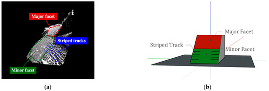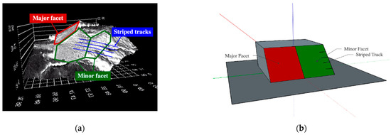 Example of the vertical slope type. These facets are the same facets shown in Figure 7a ( = 800 MPa, R = −0.5, Nf = 4.7 × 106). (a) 3D-SEM image; (b) 3D-model schematic image.
