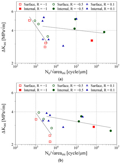In previous studies, the multiple facets were not properly distinguished [15]. Therefore, in this study, as a no-treatment control group, not only the major facet(s) area, but also the total facet area (i.e., the whole area of multiple facets) was applied to determine the crack initiation site area, (). Figure 12a,b shows the , in which the total facet area and major facet(s) area were applied, respectively. The values were obtained from the S–N curve in Figure 2. The linear relationship was calculated using the least squares method. The data were plotted separately in terms of fracture mode (i.e., surface fracture and internal fracture) and can be clearly distinguished. In both cases when the total facet area and the major facets area were applied, a larger and a smaller were derived for the internal fracture mode compared with that of surface fracture. The relatively large value of but smaller of the internal fracture regime has been reported in several studies [12,13,14]. In addition, the effects of the stress ratio on the S–N curve were almost diminished for both surface and internal fracture.